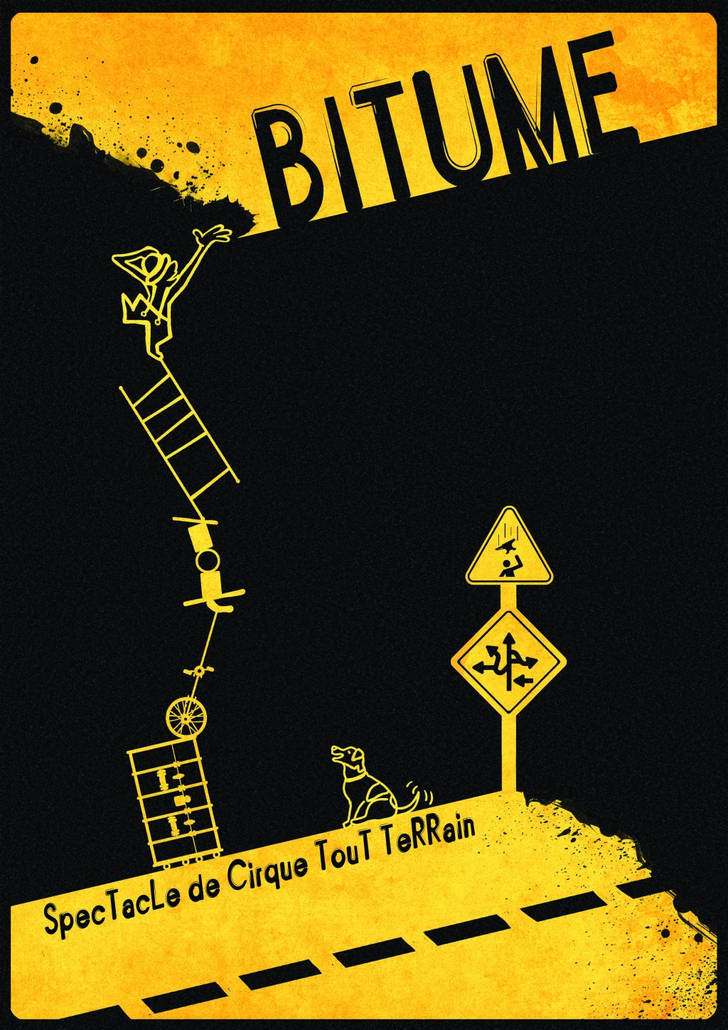 « Bitume » C’est un solo décalé de défis déjantés et d’équilibres précaires. C’est un spectacle de cirque excentrique tout terrain et tout public. C’est de la jonglerie, des équilibres et de l’improvisation. C’est un personnage tendre et attachant, poétique et malicieux, fier et heureux de présenter ses “trucs” et ses “exploits ».